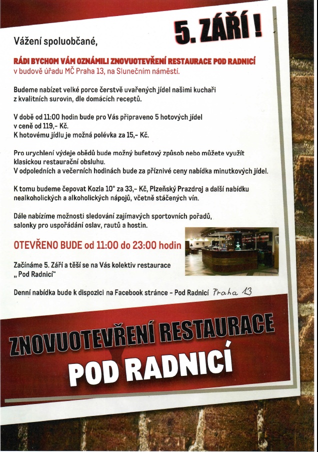 V pondělí 5. září bude pro Vás nově otevřena samoobslužná restaurace Pod radnicí v prostorách Úřadu městské části Praha 13.