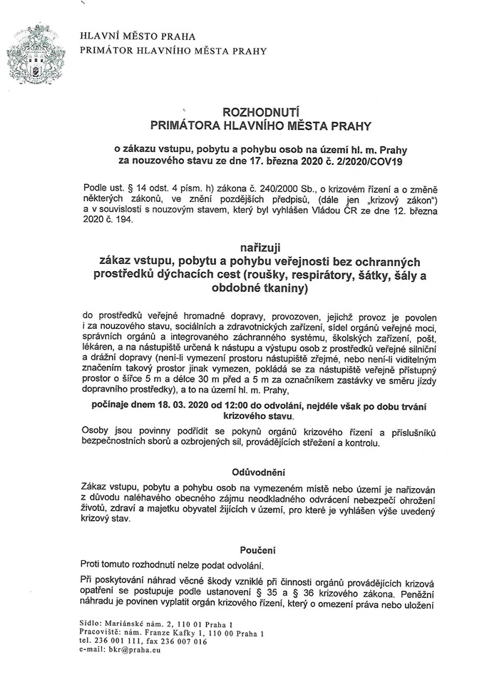 Zákaz vstupu, pobytu a pohybu veřejnosti bez ochranných prostředků dýchacích cest.