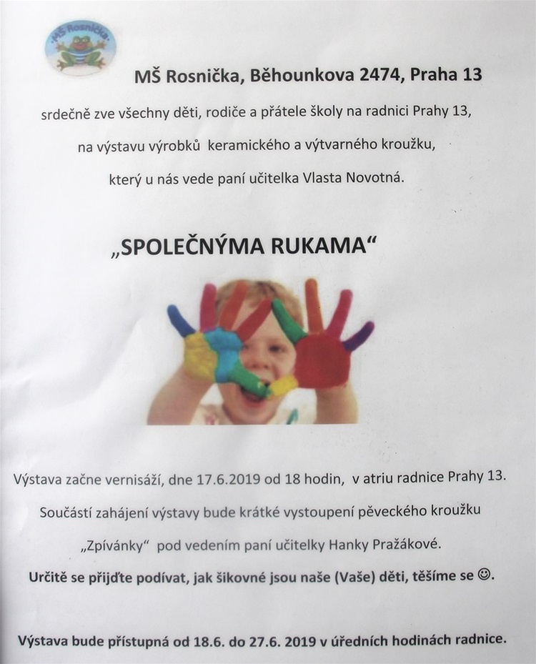 Zveme vás na výstavu keramického a výtvarného kroužku MŠ Rosnička od 18. do 27. června 2019 do atria radnice.