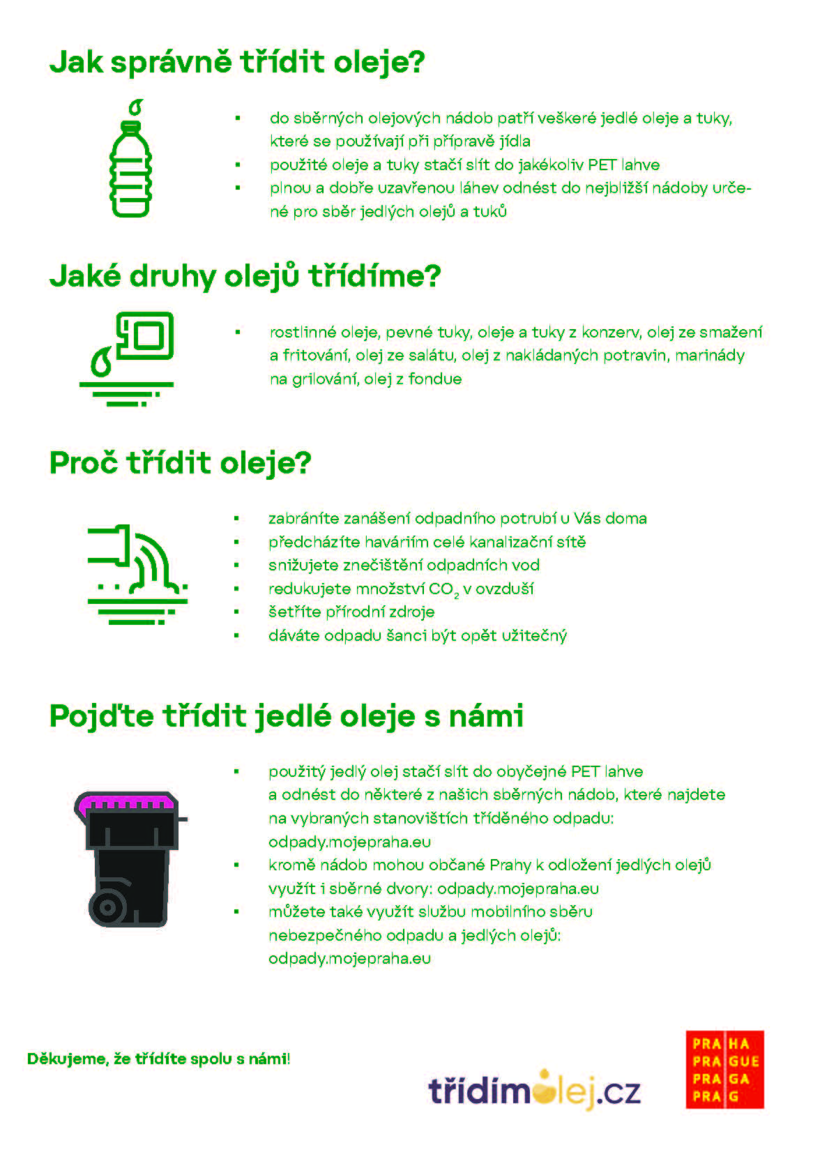 - použitý jedlý olej stačí slít do obyčejné PET lahve a odnést do některé z našich sběrných nádob, které najdete na vybraných stanovištích tříděného odpadu: odpady.mojepraha.eu