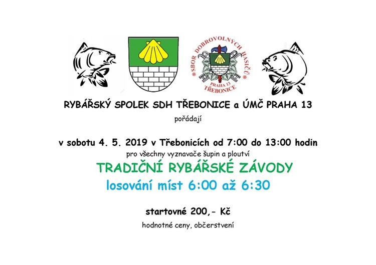 RYBÁŘSKÝ SPOLEK SDH TŘEBONICE a ÚMČ PRAHA 13 pořádají v sobotu 4. 5. 2019 v Třebonicích od 7.00 do 13.00 pro všechny vyznavače šupin a ploutví TRADIČNÍ RYBÁŘSKÉ ZÁVODY.
