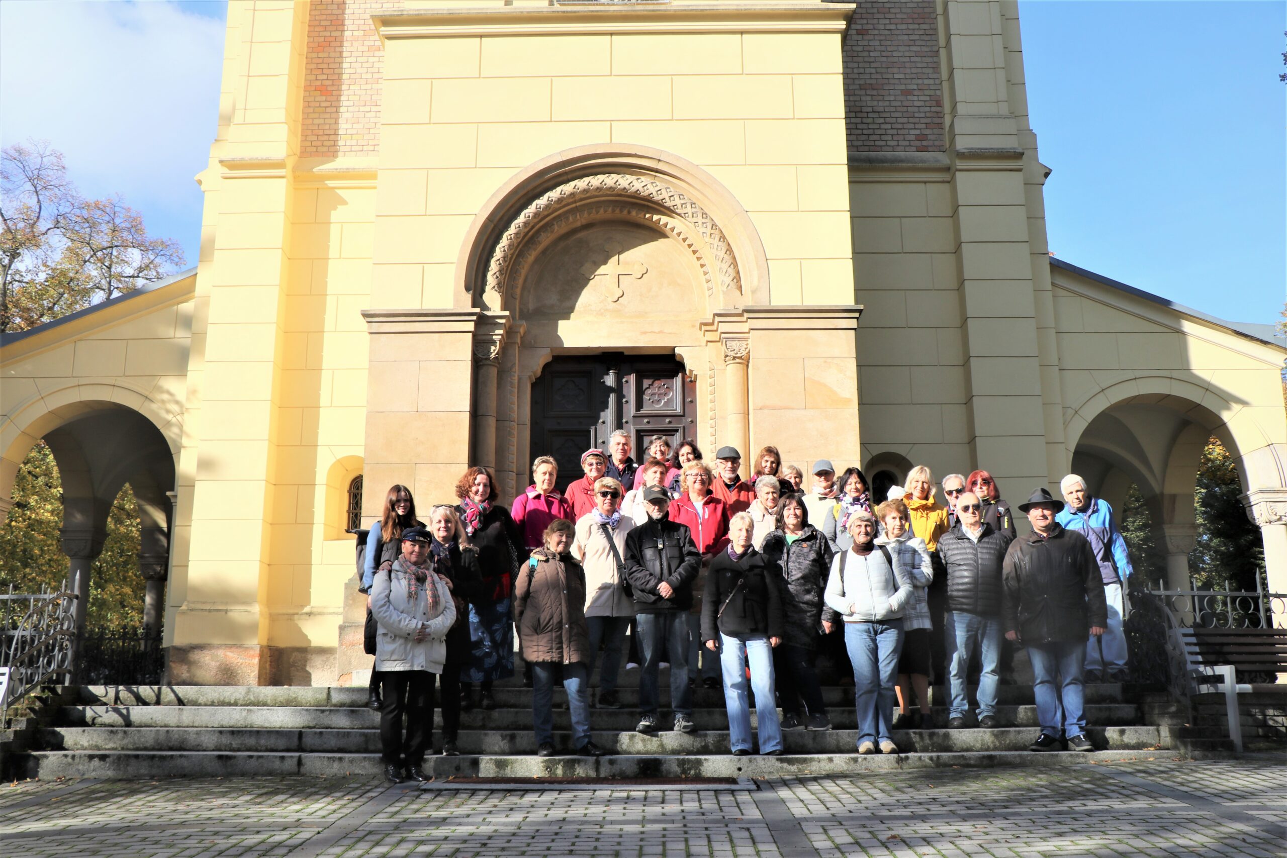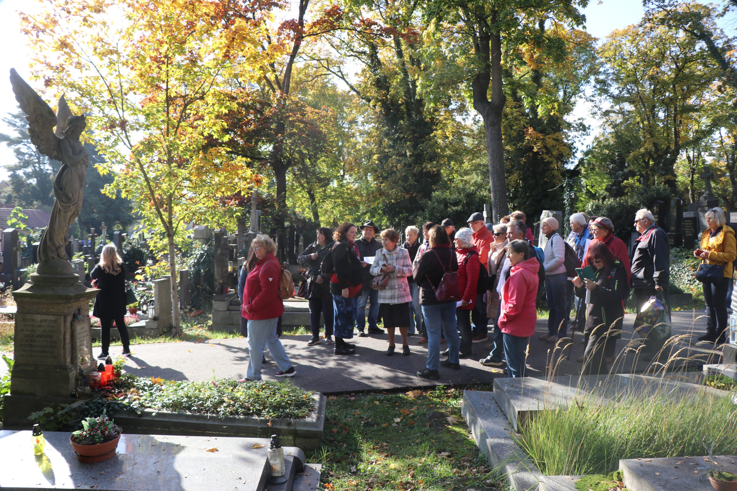 Společná prohlídka byla doprovázena krásným slunným počasím, kdy listí na stromech zářilo všemi odstíny podzimu. Sluneční paprsky se proplétaly mezi větvemi a vytvářely kouzelnou atmosféru, kterou umocňovala dlouhá historie a pietní klid tohoto místa.