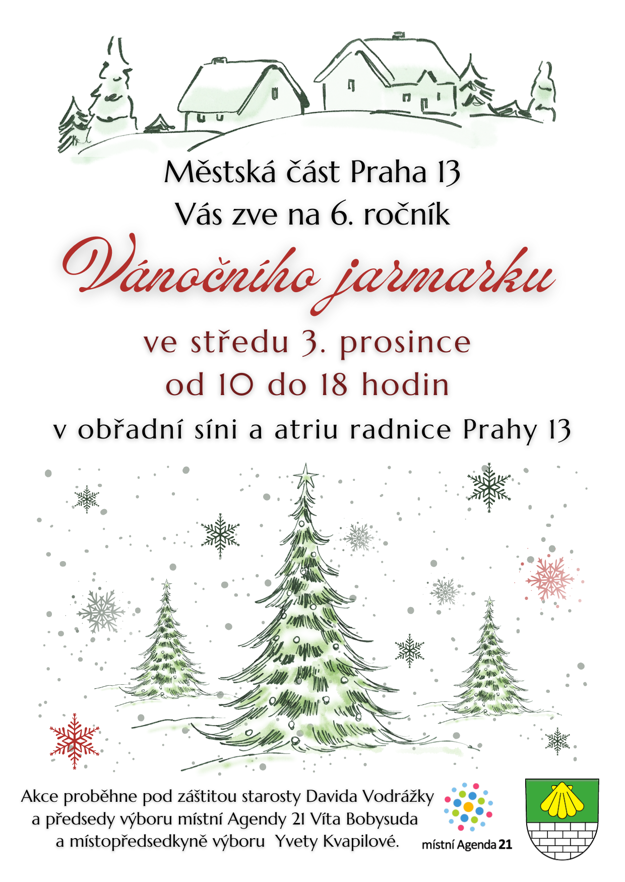 Městská část Praha 13 si Vás dovoluje srdečně pozvat na 6. ročník Vánočního jarmarku, který se uskuteční ve středu 3. prosince 2025 od 10:00 do 18:00 hodin v prostorách obřadní síně a atria radnice MČ Praha 13, Sluneční náměstí 2580/13.