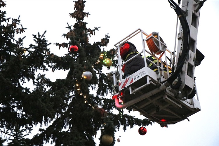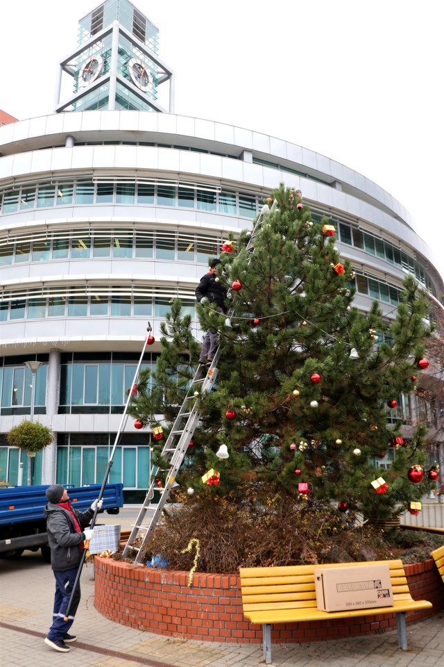 ale v letošním roce jsou přidány i vánoční ozdoby. Borovice před radnicí byly