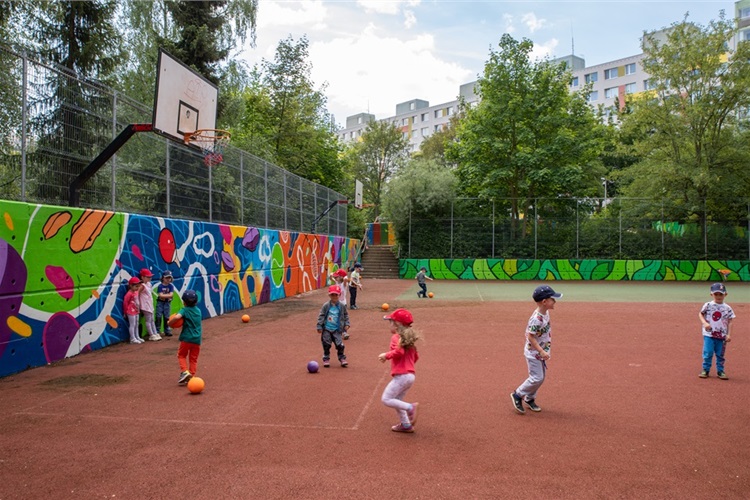 rekonstrukci sportovního hřiště v Podpěrově ulici a místo doslova září barvami.
