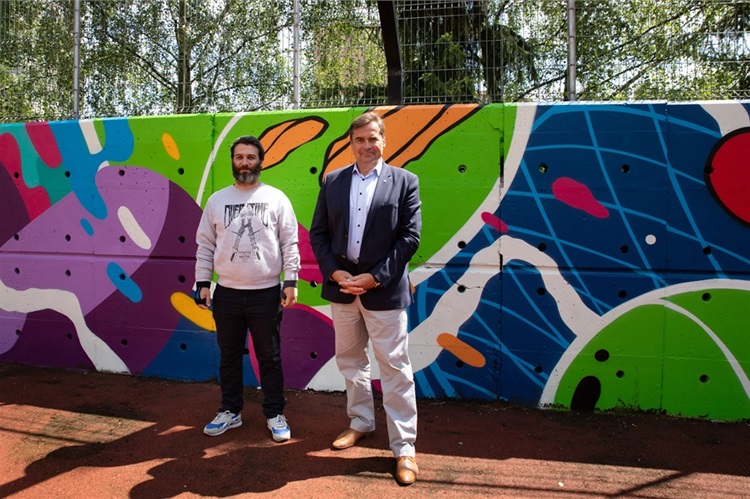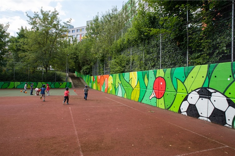 velkoplošné malby přizval další kolegy a zdi kolem sportoviště se tak staly i
