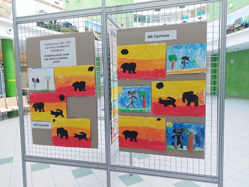 Výstava obrázků dětí z MŠ Prahy 13 na téma divadélka „Zvědavé slůně aneb Jak sloni k chobotu přišli“