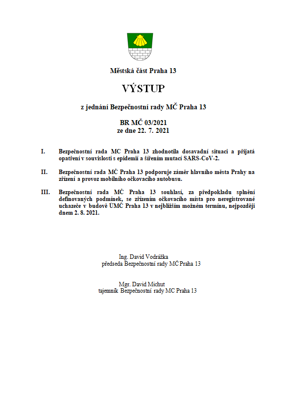 Výstup z jednání Bezpečnostní rady MČ Praha 13 ze dne 22. 7. 2021