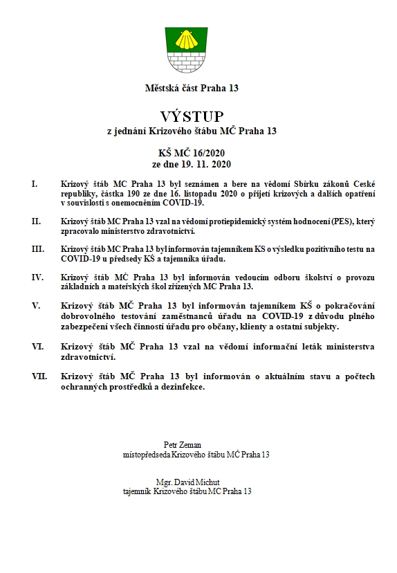 Aktuální informace z jednání Krizového štábu MČ Praha 13 z 19. 11. 2020