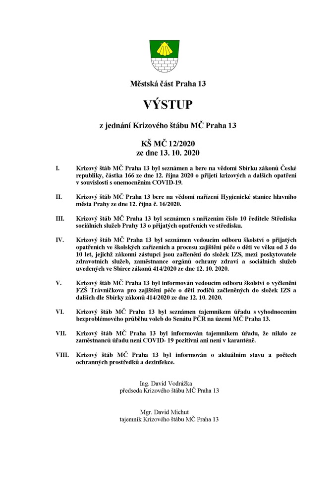 Aktuální informace z jednání Krizového štábu MČ Praha 13 z 13. října.