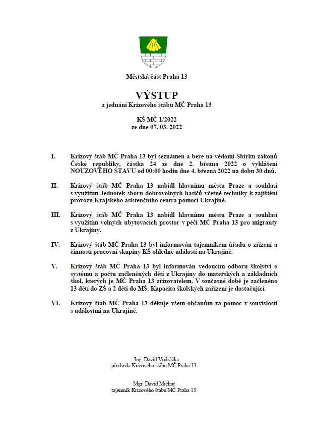 Aktuální informace z jednání Krizového štábu MČ Praha 13 ze dne 7.3.2022
